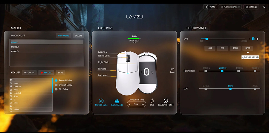 Users can customize DPI, LOD and Polling rate these settings from our web driver