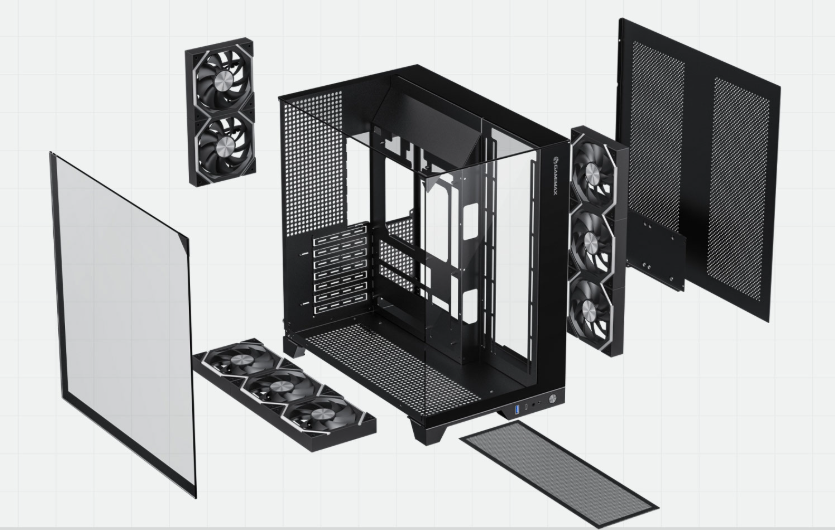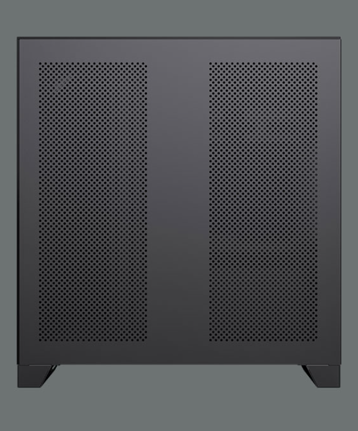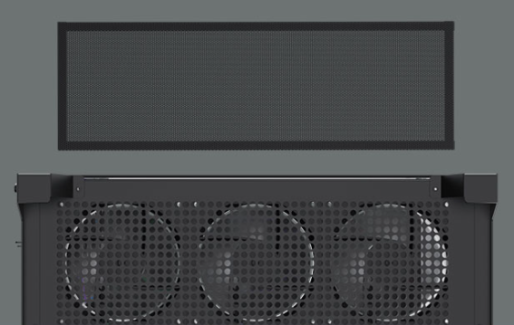 The right side panel features a large, integrated stamped mesh design with 3mm diameter holes, enhancing cooling while also providing dust protection. |
