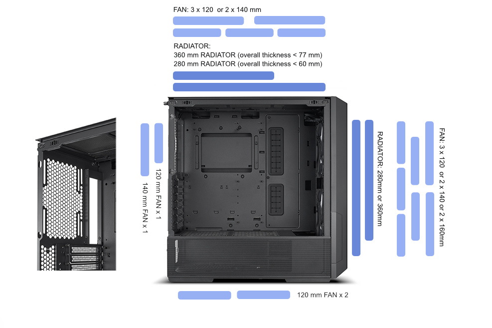 Pre-installed at the front of the top radiator bracket, a seal plate ensures no pressure leak is created when installing smaller than a 360 radiator/3x120mm fans at the top.