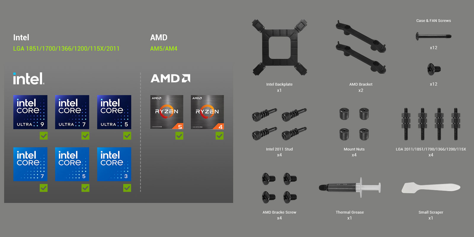 | Compatible | AM5, AM4, LGA1851, LGA1700, LGA115X, LGA1200, LGA1366 |