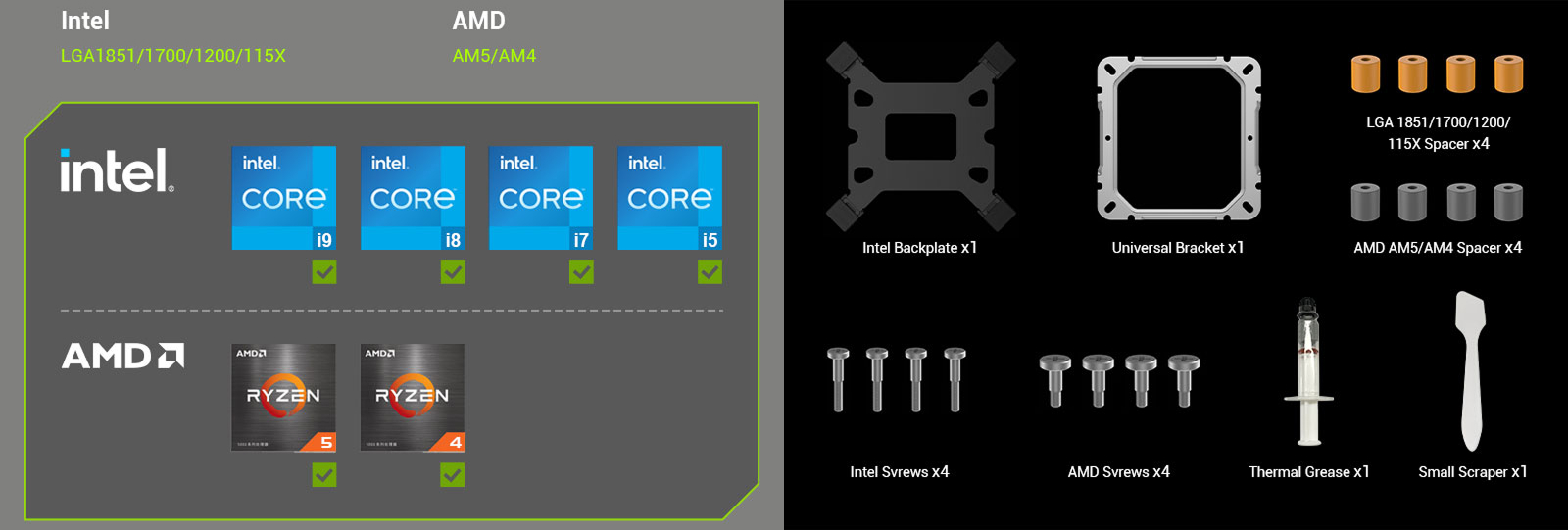 | Compatible | AM5, AM4, LGA1851, LGA1700, LGA115X, LGA1200 |