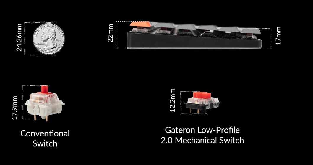 Low-Profile Gateron Switch The Gateron low-profile MX 2.0 Mechanical switch is designed to enhance reliability. Gateron's reputable switches are your best choice for a precise, smooth, and reliable fingertip feel whether you prefer linear (red) or tactile (brown/banana).