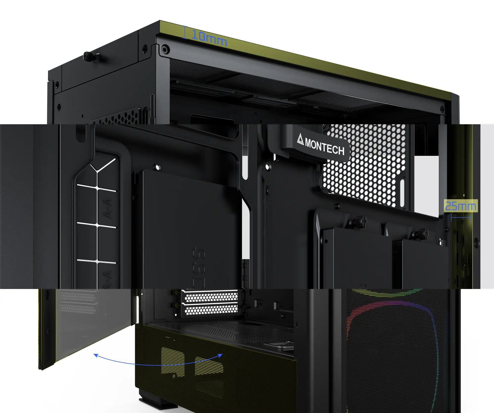 | 3 Enhancement Based on valuable feedback from original SKY TWO users, MONTECH has fine-tuned the GX edition to approach perfection. Three key enhancements have been implemented in the SKY TWO GX: ▶ 10mm added height at the top for support 66mm radiator thickness. ▶ 5mm amplified room for cable management, SKY TWO GX’s cable management space is now 25mm! ▶ Door-opening glass panel, thumbs screws for the PCIe slots, and an easy removal design for the lower side mesh panel. |