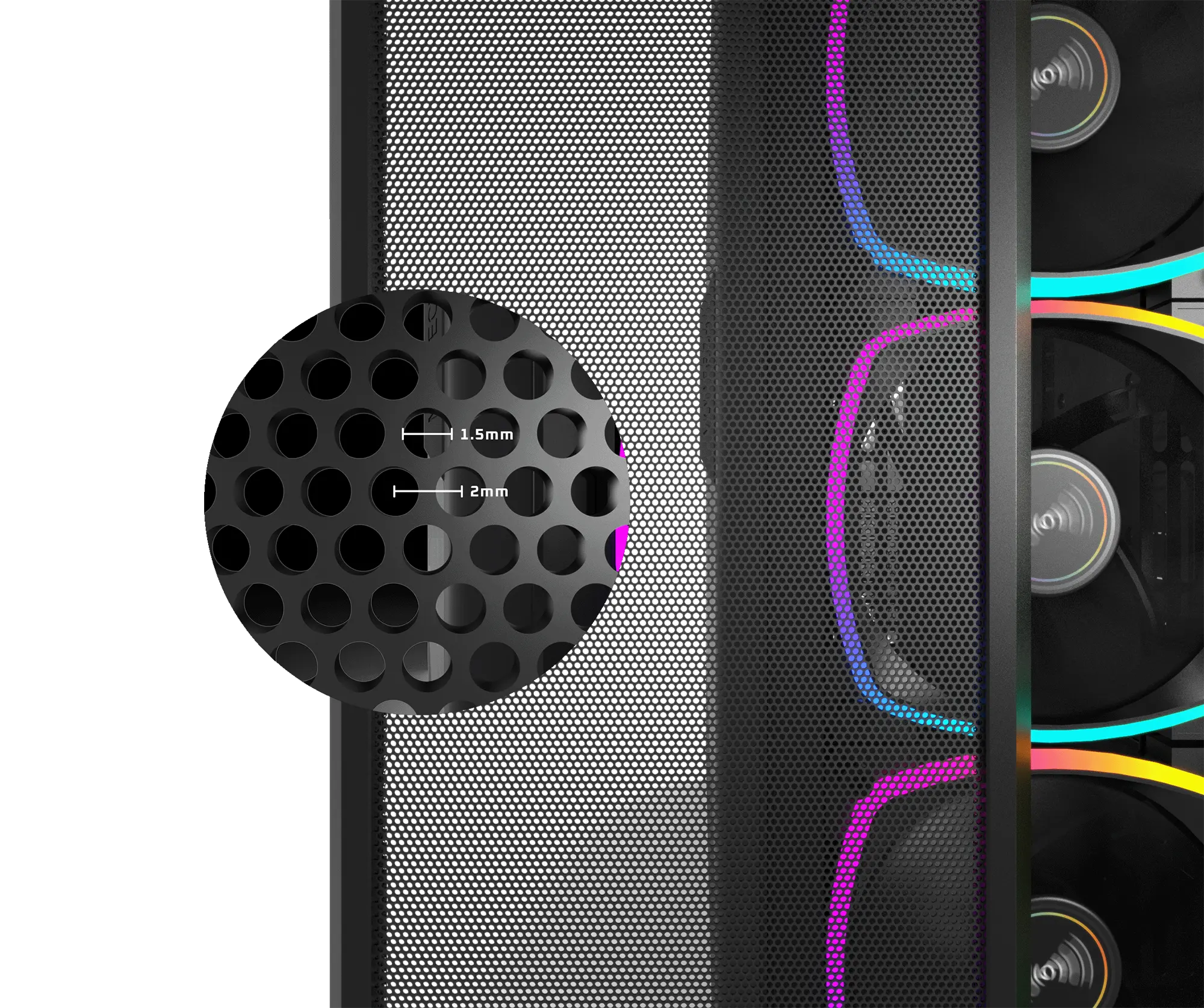 | Innovative Mesh Front Panel The metal mesh front panel of SKY TWO GX has up to 51% porosity, providing dustproof protection as well. With the quick-release mechanism, the front panel can be removed easily. |