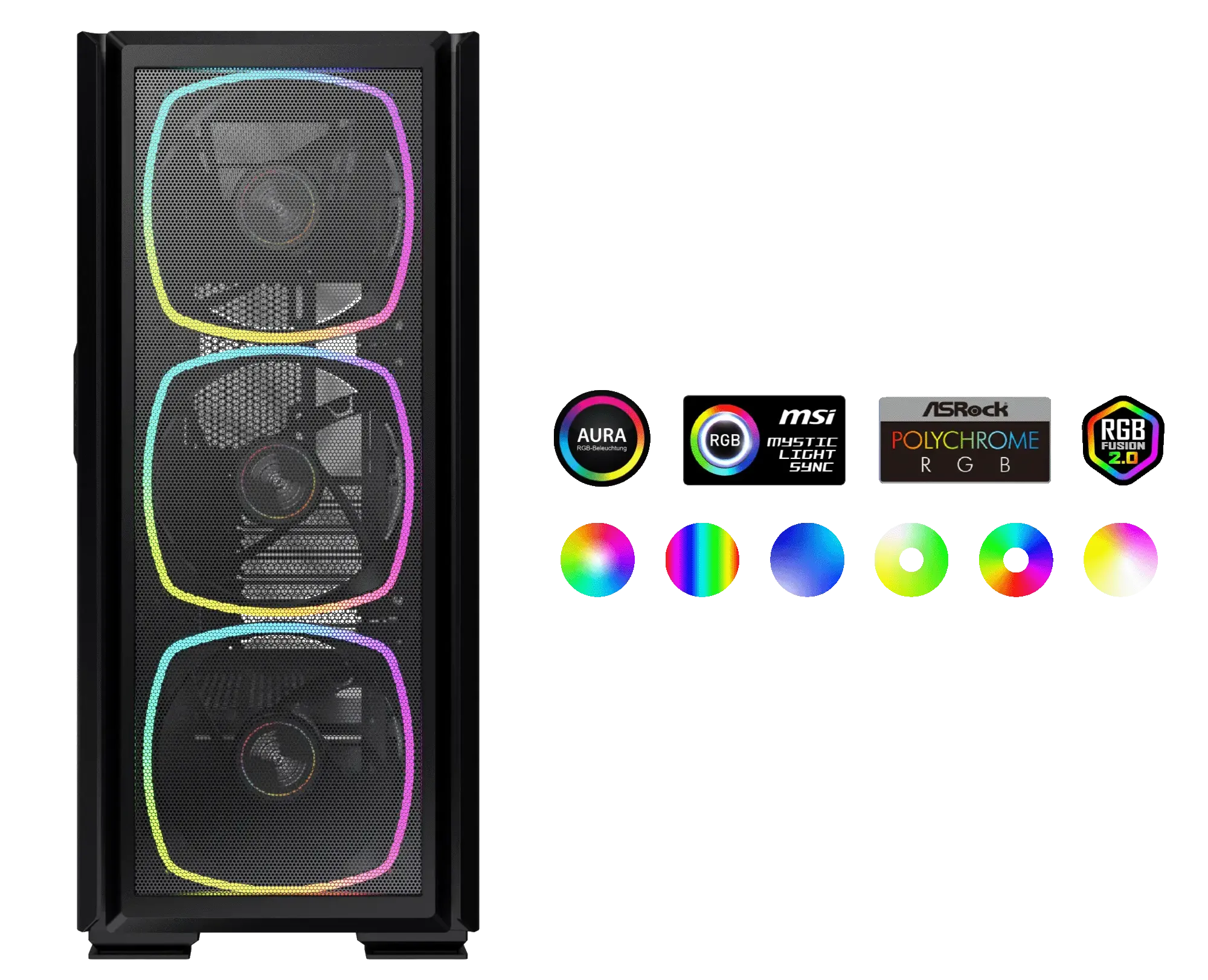 | 3 x High-Performance AX140 ARGB Fans The SKY TWO GX is equipped with 3x AX140 ARGB PWM fans at the front, ensuring a blend of high airflow and low noise levels. The fan speed is adjustable through the PWM function, allowing synchronization with the motherboard for a personalized lighting display. |