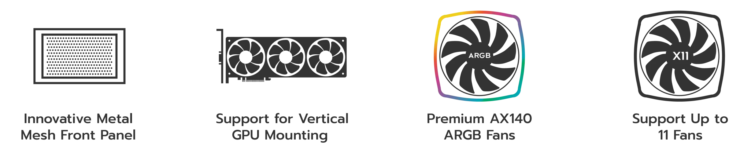 | High-End Hardware Compatibility ▶ Up to 400mm length for graphics card (RTX 4090 compatible) ▶ 168mm height for CPU cooler ▶ 210mm clearance for PSU ▶ Support for 360mm Radiator at the Top and Front ▶ Support Up to 11 Fans |