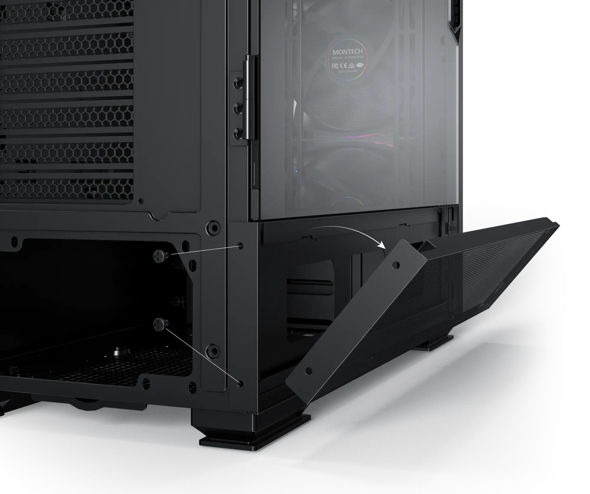 | Unique Bottom Mesh Structure Inheriting the SKY TWO design, GX continued the bottom mesh structure from the front panel to the power supply chamber for all-around airflow. With a simplified disassembly step of removing two rear screws to detach the mesh. |