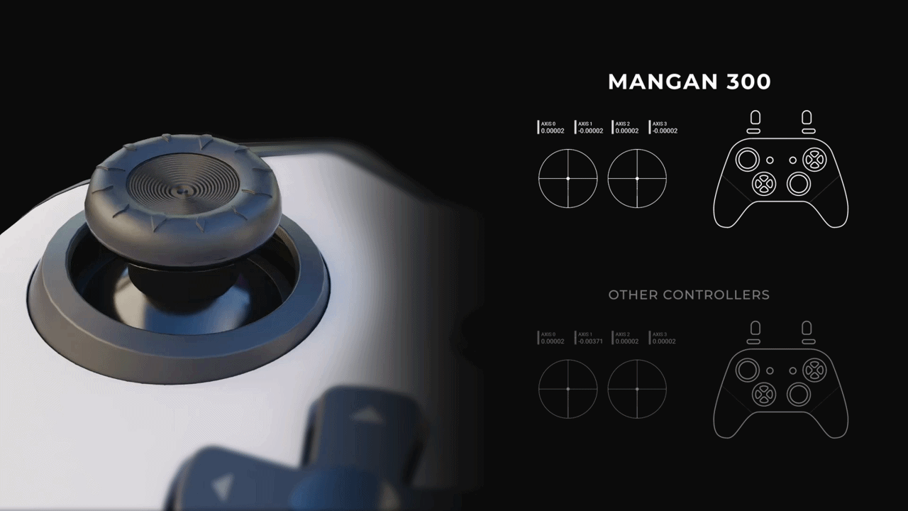 PERFECT JOYSTICKS Perfect reproduction of joystick movements ensures that during the gameplay, you can fully utilise your own skills. It will not limit them to simplified controls characteristic of competitive controllers - with Mangan 300, tilting the stick in your chosen direction will execute a smooth and precise movement in a circle. |