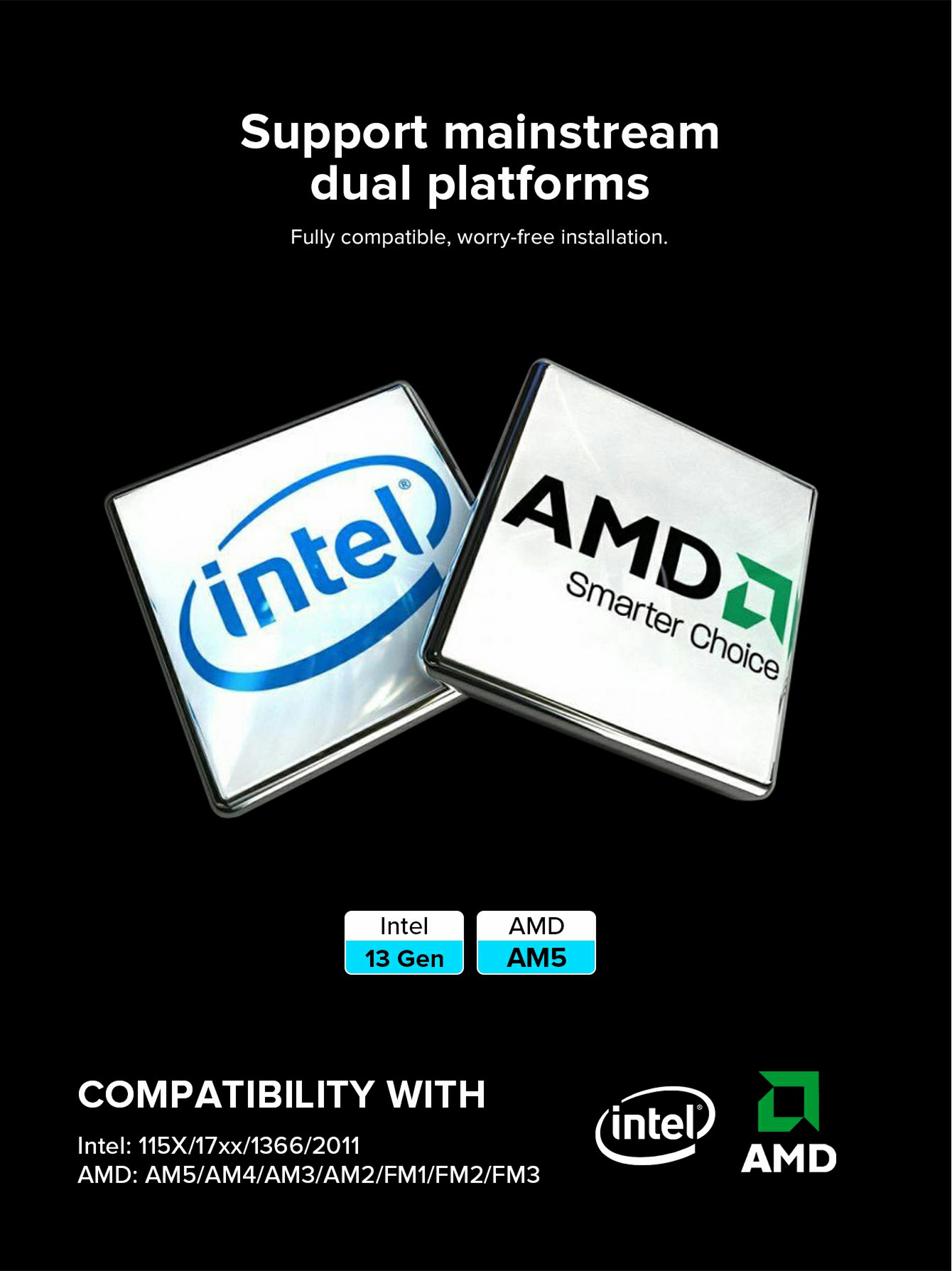 Saderīgs: AM5, AM4, LGA1851, LGA1700, LGA115X, LGA1366, AM2, AM3, FM1, FM2, LGA2011, FM3